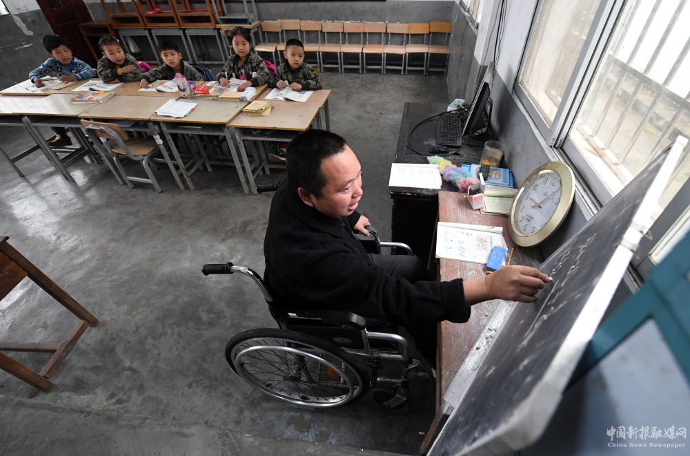 在廣西凌云縣下甲鎮(zhèn)河洲村念恩小學(xué),阮文憑老師坐在輪椅上給學(xué)生上課(2019年3月26日攝)。