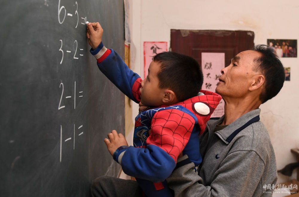 在廣西融水苗族自治縣汪洞鄉(xiāng)新合村達(dá)佑教學(xué)點(diǎn),學(xué)校唯一的老師周宏軍抱著一名夠不著黑板的學(xué)生做課堂作業(yè)(2019年5月28日攝)。