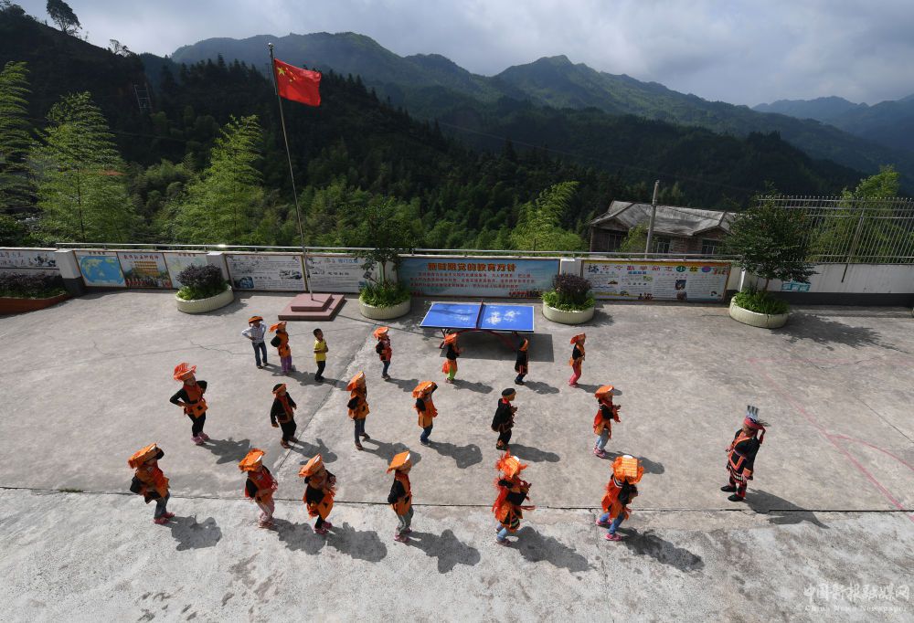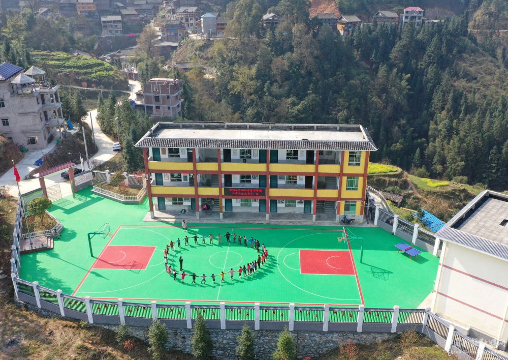 登曬小學(xué)師生在課間一起做游戲(2019年3月12日攝)。登曬小學(xué)地處黔桂邊界,同屬貴州省黎平縣龍額鎮(zhèn)和廣西壯族自治區(qū)三江侗族自治縣富祿苗族鄉(xiāng),是黔桂共建的一個教學(xué)點(diǎn),師生有的來自貴州,有的來自廣西,有“一??鐑墒^(qū)、兩省區(qū)轄一校”之稱。
