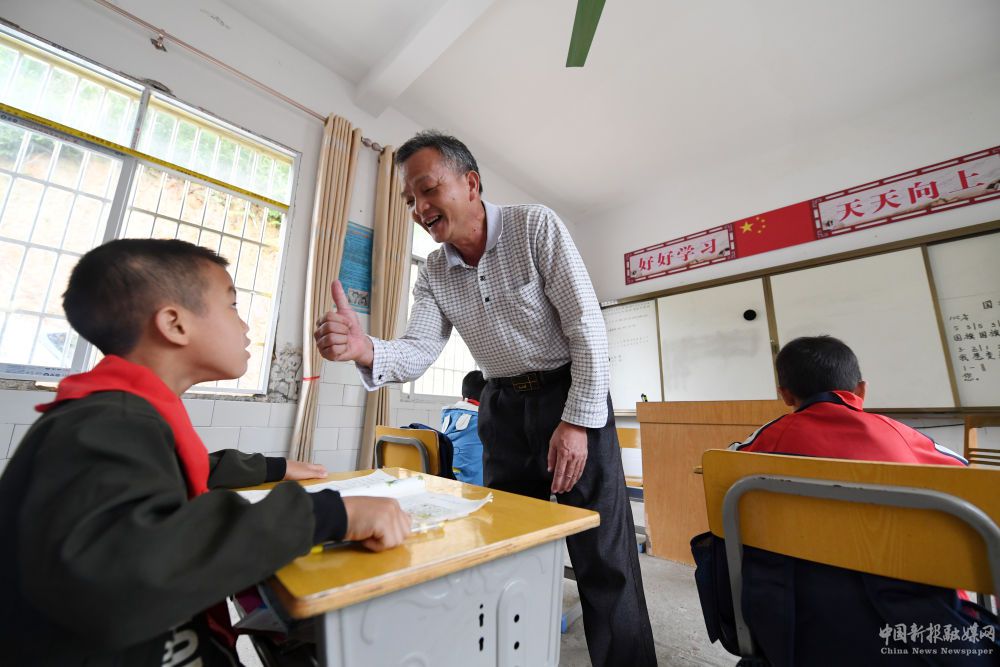 在廣西昭平縣五將鎮(zhèn)良風(fēng)村小學(xué)沖尾教學(xué)點(diǎn),龔壽新老師在課堂上表揚(yáng)一名學(xué)生(2020年5月25日攝)。龔壽新從事教育工作后,一直在這所教學(xué)點(diǎn)工作,至今已連續(xù)堅守這里41年。