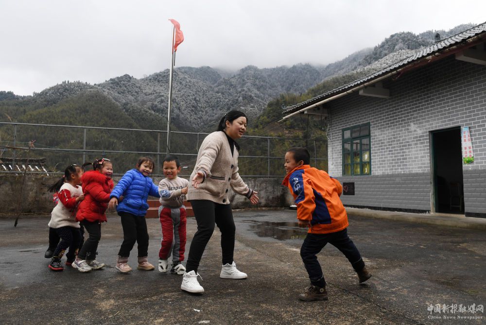 在廣西靈川縣蘭田瑤族鄉(xiāng)東良教學(xué)點(diǎn),石夏月老師和學(xué)生在做游戲(2022年2月24日攝)。