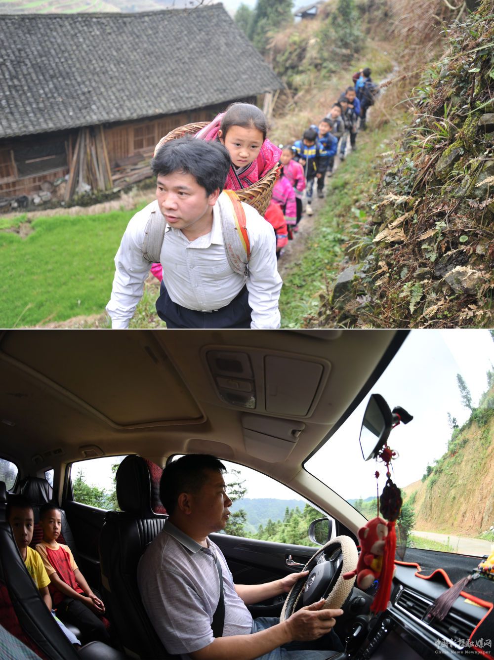 上圖:在廣西龍勝龍脊鎮(zhèn)江柳村,余啟貴老師在放學(xué)路上將一名走不動了的學(xué)生背在背簍里,領(lǐng)著其他學(xué)生一起回家(2013年2月26日攝);下圖:在廣西龍勝龍脊鎮(zhèn)江柳村,余啟貴老師開著自己的汽車帶著學(xué)生去學(xué)校(2020年7月7日攝)。