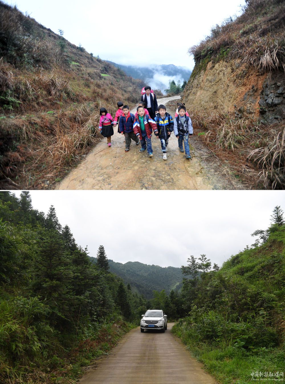 上圖:在廣西龍勝龍脊鎮(zhèn)江柳村,余啟貴老師背著背簍領(lǐng)著學(xué)生去學(xué)校(2013年2月26日攝);下圖:在廣西龍勝龍脊鎮(zhèn)江柳村,余啟貴老師開著自己的汽車帶著學(xué)生去學(xué)校(2020年7月7日攝)。