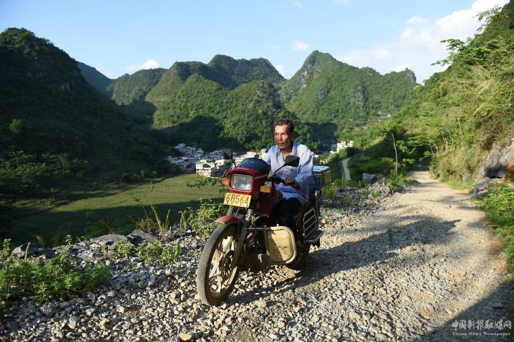 在廣西天等縣寧干鄉(xiāng)黎明村明屯教學(xué)點(diǎn),梁正文老師在放學(xué)后騎車回家的路上(2015年6月16日攝)。