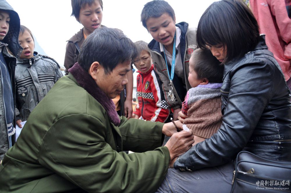 在廣西大化瑤族自治縣大化鎮(zhèn)龍馬村龍萬移民新村教學(xué)點(diǎn),班愛花老師抱著一個發(fā)燒的小孩讓醫(yī)生打針治療(2012年1月11日攝)。
