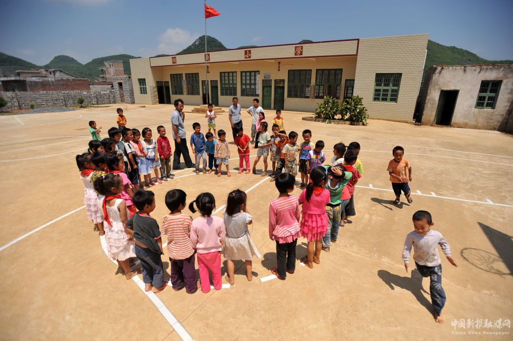 湖廣小學(xué)師生在校園里做游戲(2013年6月19日攝)。湖廣小學(xué)位于湘桂邊界,師生有的來自湖南,有的來自廣西,有“一校跨兩省區(qū)、兩省區(qū)轄一校”之稱。
