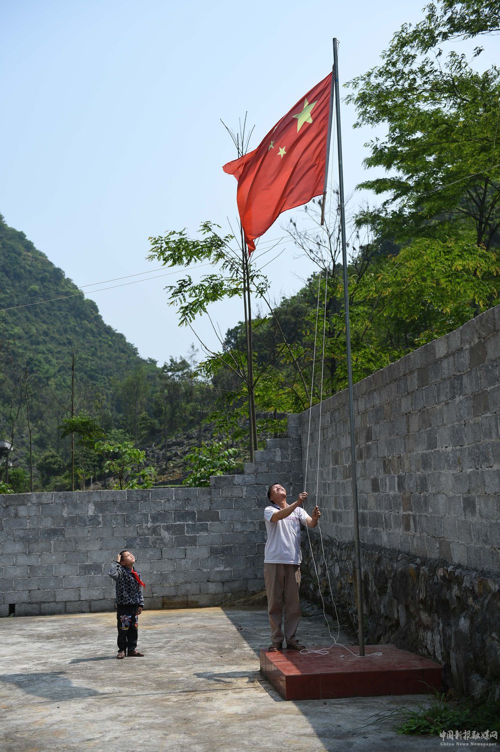 在廣西都安瑤族自治縣菁盛鄉(xiāng)義德小學(xué)弄豆教學(xué)點(diǎn),藍(lán)啟飛老師和學(xué)生藍(lán)孟源在升國旗(2015年4月15日攝)。藍(lán)啟飛是這所教學(xué)點(diǎn)唯一的老師,藍(lán)孟源是這所教學(xué)點(diǎn)唯一的學(xué)生。
