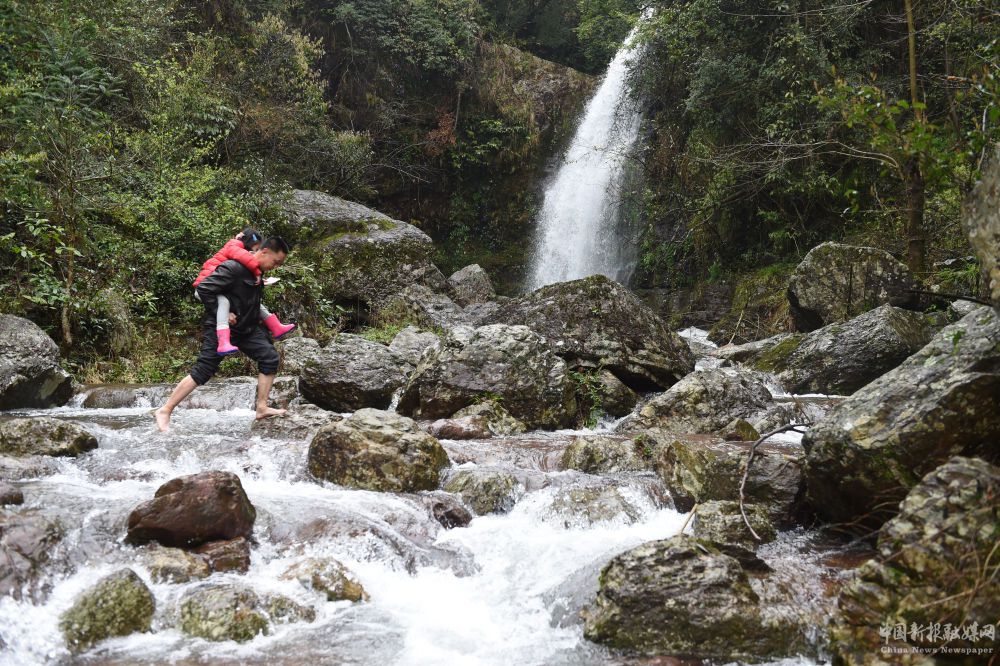 在廣西灌陽縣洞井瑤族鄉(xiāng)野豬殿村,野豬殿村小學(xué)老師周運(yùn)雄放午學(xué)后背著一名學(xué)生走過被流水淹沒的路段回家(2016年3月22日攝)。