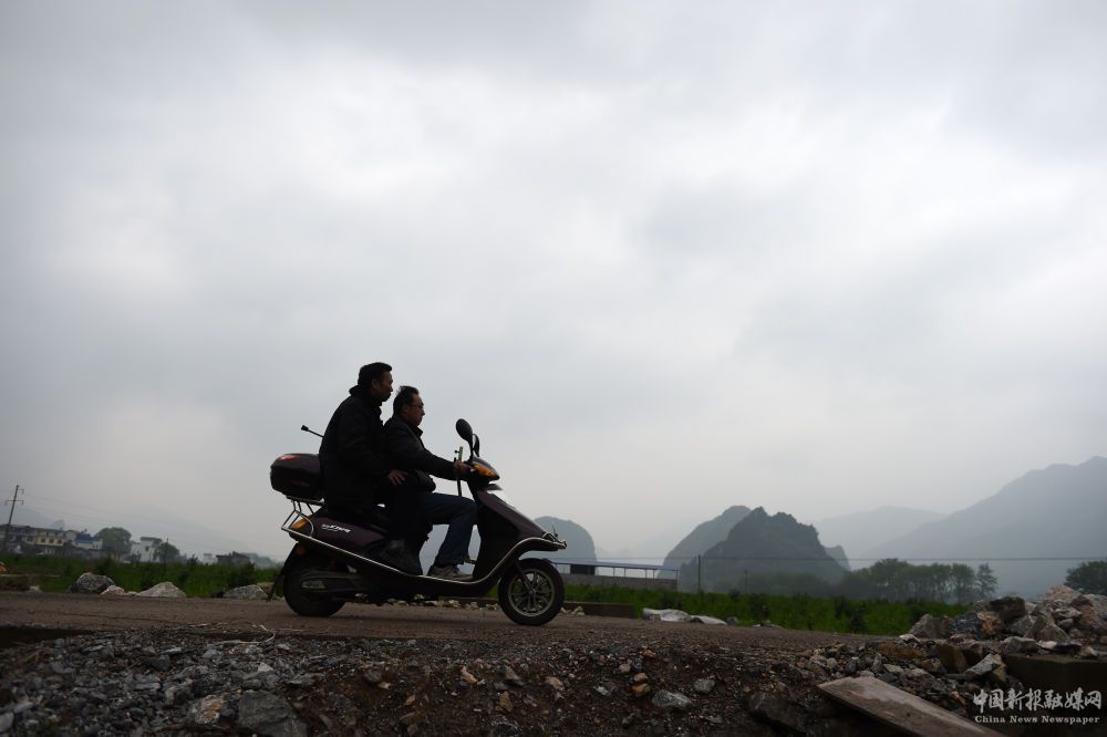 在廣西灌陽縣洞井瑤族鄉(xiāng),桂平巖小學(xué)老師趙仁斌(前)用電單車將楊大杰老師載去學(xué)校的路上(2016年3月24日攝)。2015年3月,楊大杰被診斷為股骨頭壞死,經(jīng)過一段時間治療病情有所緩解后,他堅持帶病回到教學(xué)崗位上。