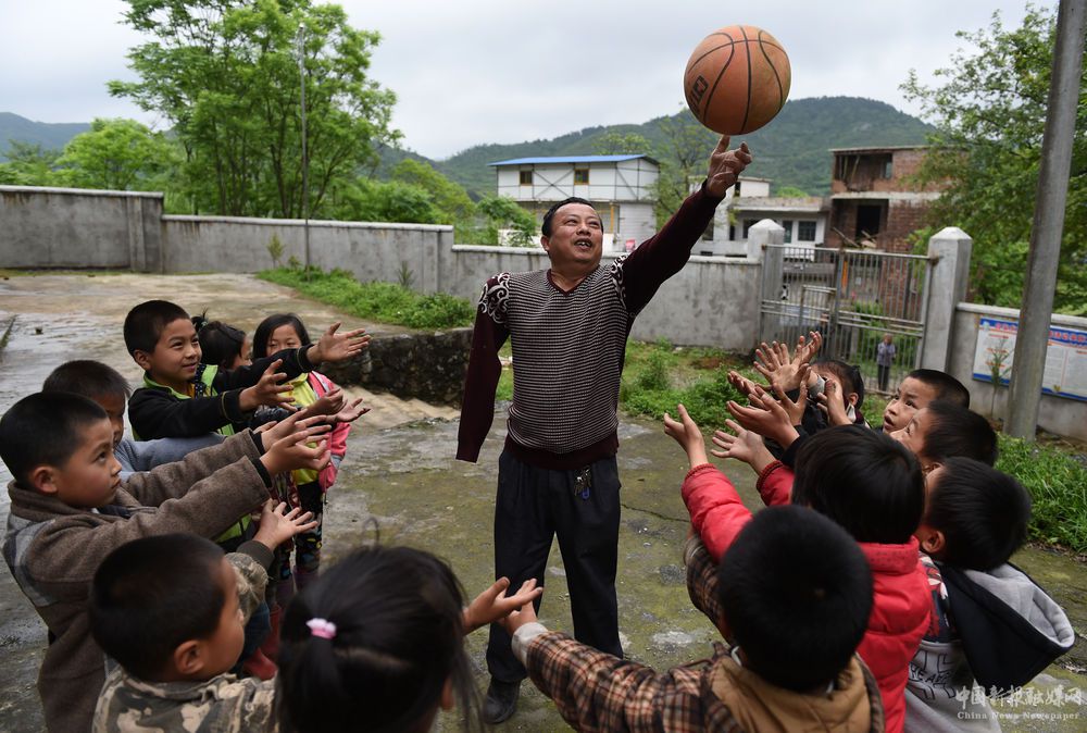 在廣西全州縣白寶鄉(xiāng)北山村小學(xué),右手殘疾的唐廣芳老師在給學(xué)生上體育課(2016年4月26日攝)。