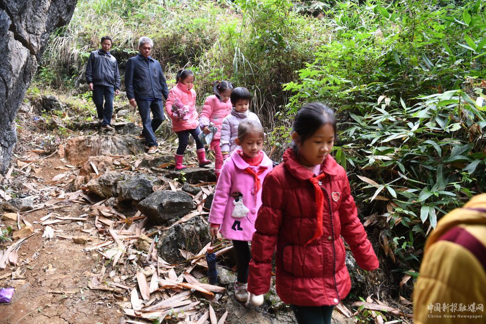 廣西大新縣寶圩鄉(xiāng)那排教學(xué)點(diǎn)覃誠老師(左二)和覃永忠老師(左一)陪同學(xué)生走山路回家(2017年11月24日攝)。