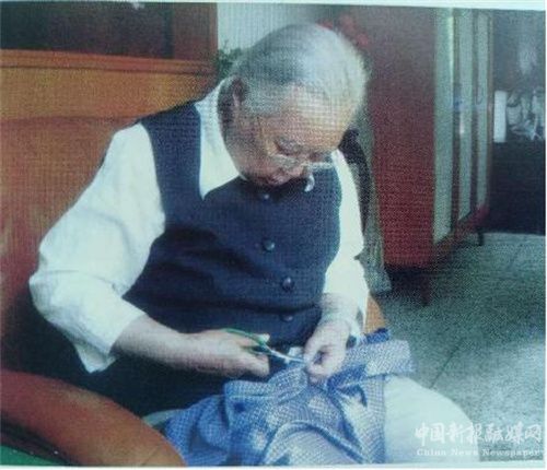 90歲高齡的張文縫補(bǔ)自己的衣服。