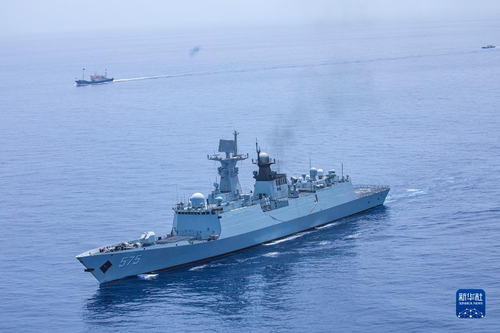 中國海軍第40批護航編隊中的岳陽艦在執(zhí)行護航任務(6月4日攝)。新華社發(fā)(楊捷 攝)