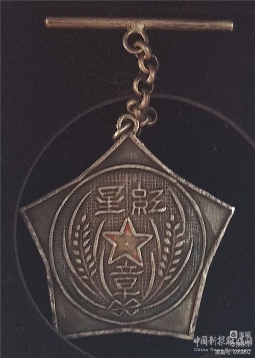 “這是一枚1933年“八一”建軍節(jié)首次頒發(fā)的銅質(zhì)紅星獎(jiǎng)?wù)?,為鈍角五角星形狀,中間有一小紅星,紅星左右兩側(cè)由禾穗環(huán)抱,上部有“紅星”二字,從右向左布列,下部有“章”字;背面有“中央革命軍事委員會(huì)三等紅星獎(jiǎng)?wù)拢痪湃?middot;八·一,第101號(hào)”字樣。“101”就是家父的獎(jiǎng)?wù)戮幪?hào)。”