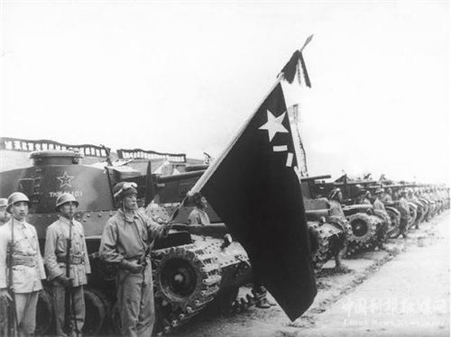 1949年8月1日,中國(guó)人民解放軍隆重舉行“八一建軍節(jié)”二十二周年紀(jì)念活動(dòng)。圖為軍旗照耀下的人民坦克部隊(duì)。