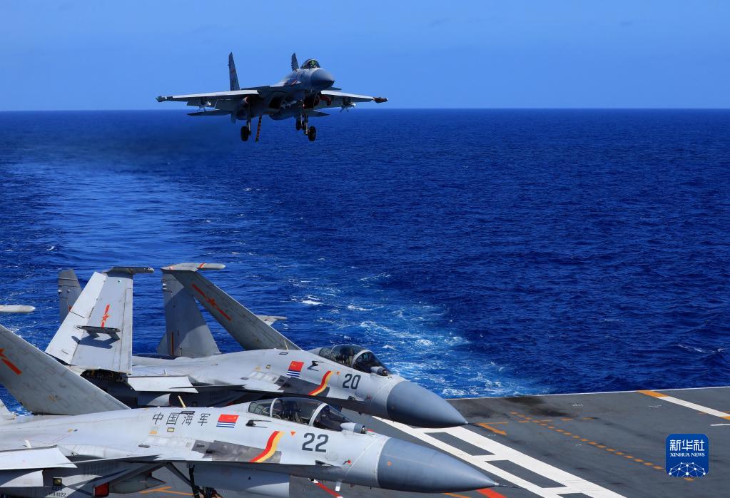 海軍遼寧艦編隊遠海實戰(zhàn)化訓練期間,殲-15艦載戰(zhàn)斗機準備著艦(資料照片)。新華社發(fā)(胡善敏 攝)