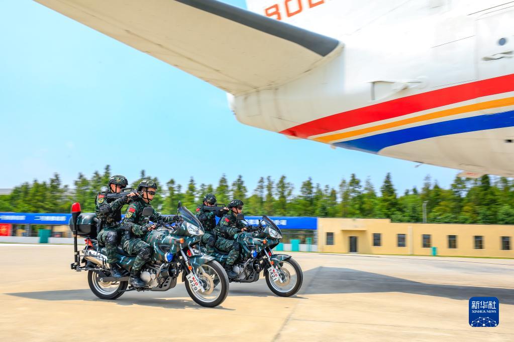 武警上海總隊機動第一支隊特戰(zhàn)某中隊組織交通工具反劫持綜合演練,特戰(zhàn)隊員乘坐摩托車接近“被劫持飛機”(2022年8月1日攝)。新華社發(fā)(李巖 攝)