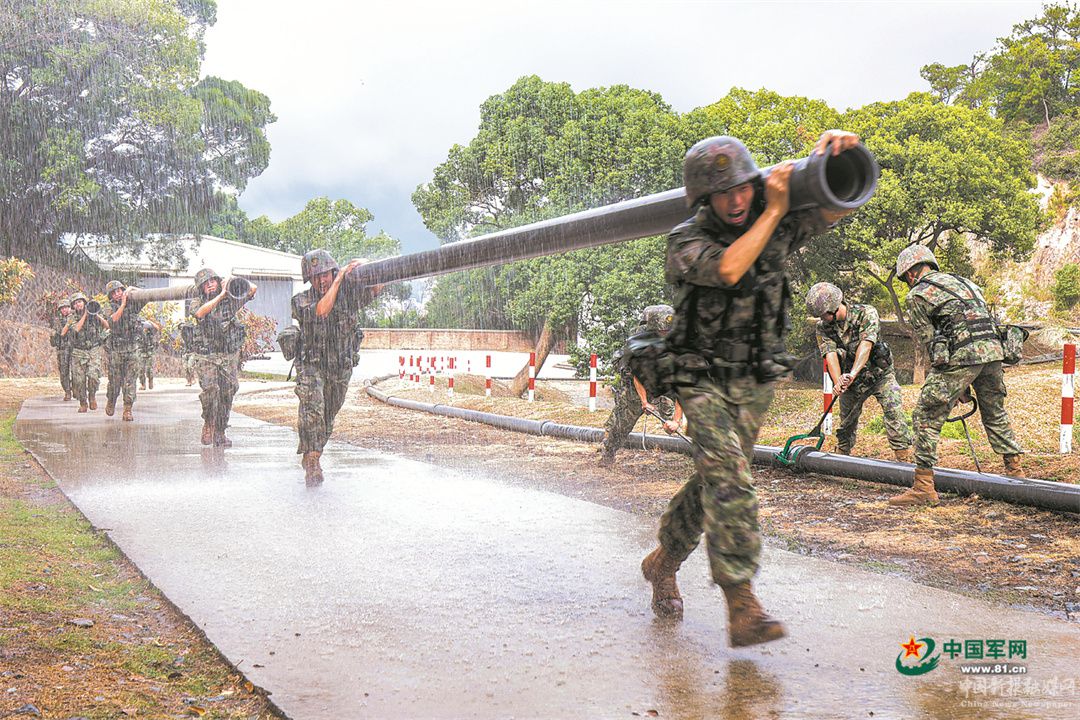 聯(lián)勤保障部隊(duì)某團(tuán)官兵冒雨開展管線鋪設(shè)演練。張佳豪 攝