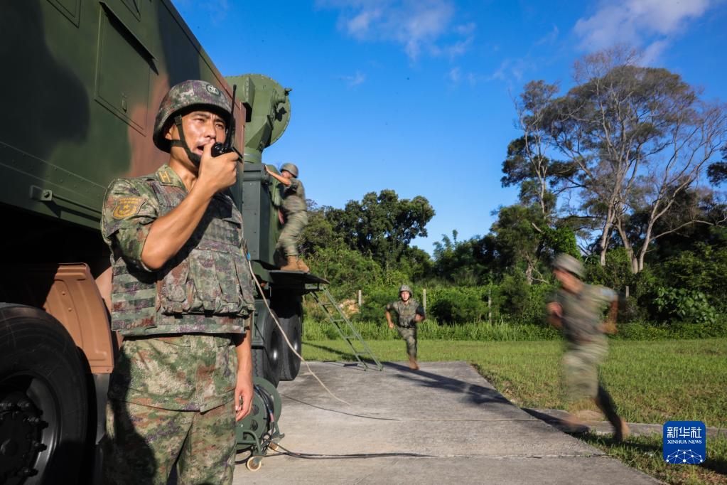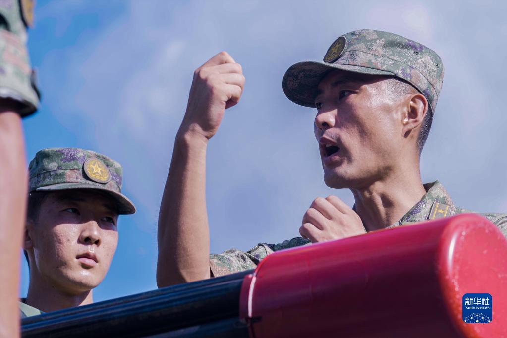 駐香港部隊某團防空營營長王海旭(左)在訓(xùn)練中下達作戰(zhàn)指令(2022年7月21日攝)。新華社發(fā)(田越洋 攝)