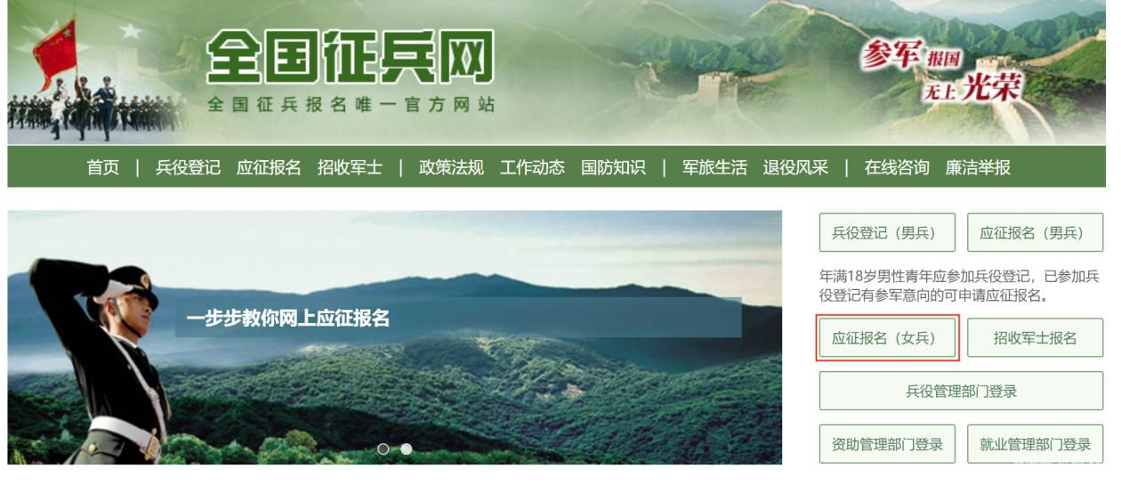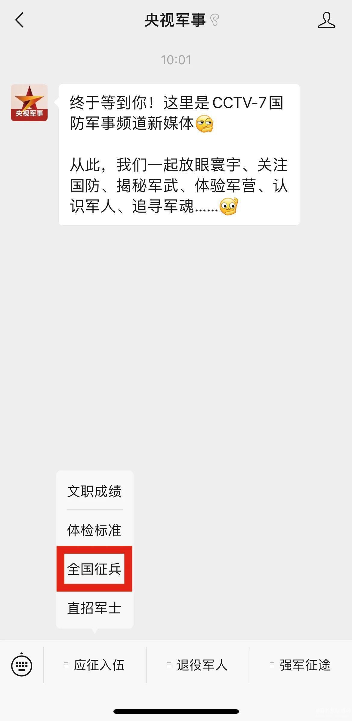 方式一:關注“央視軍事”微信公眾號,點擊首頁菜單“應征入伍”→“全國征兵”