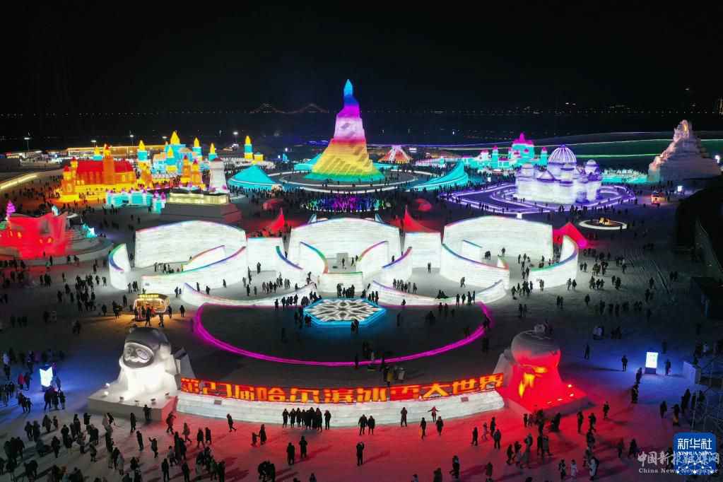 2021年12月25日,游客在哈爾濱冰雪大世界園區(qū)游玩(無人機(jī)照片)。