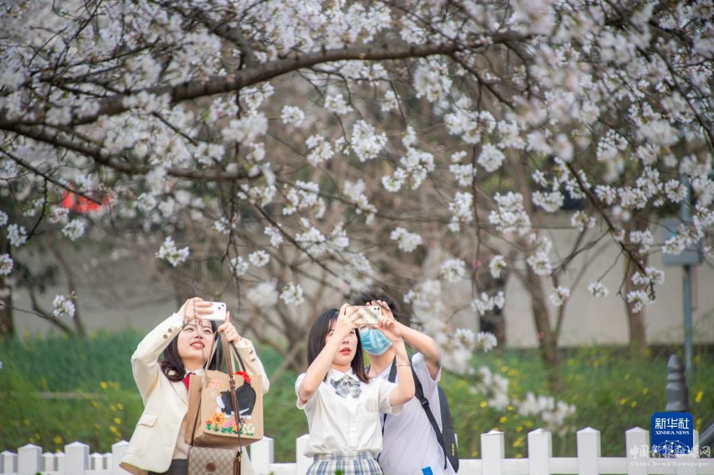 柔風漸暖,湖北武漢東湖櫻園的櫻花競相綻放,吸引眾多市民前來游園觀賞。