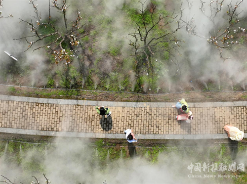 游客在衡陽市珠暉區(qū)茶山坳鎮(zhèn)金甲梨園里踏青賞花。 (羅盟攝)