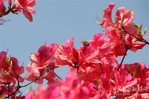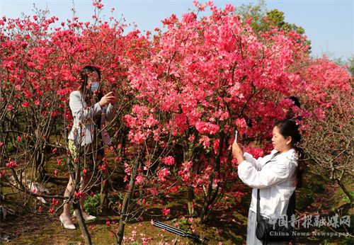 人間芳菲四月天。2022年4月2日,周六,安徽省合肥市廬江縣白湖鎮(zhèn)鄧湖村上萬株野生映山紅陸續(xù)開始綻放,在春日暖陽照耀下,如云似錦,遍布村頭,一團(tuán)團(tuán),一簇簇,在春日新綠的映襯下分外美麗,蜜蜂在花朵間飛舞采蜜。遵循疫情期間減少外出旅游的要求,來自廬江當(dāng)?shù)氐氖忻?、村民紛至沓來,徜徉花海,趁著春日暖陽,盡情享受“家門口”這極具詩情畫意的生態(tài)景色。