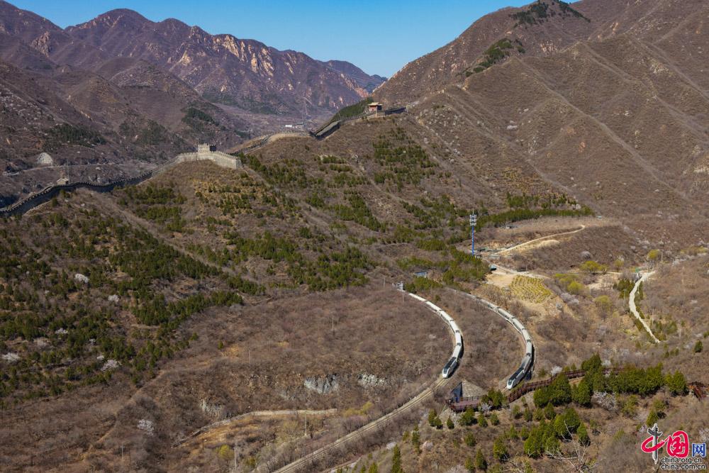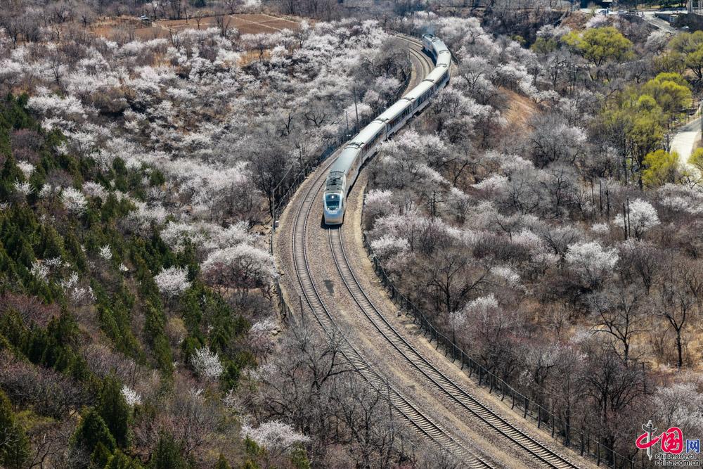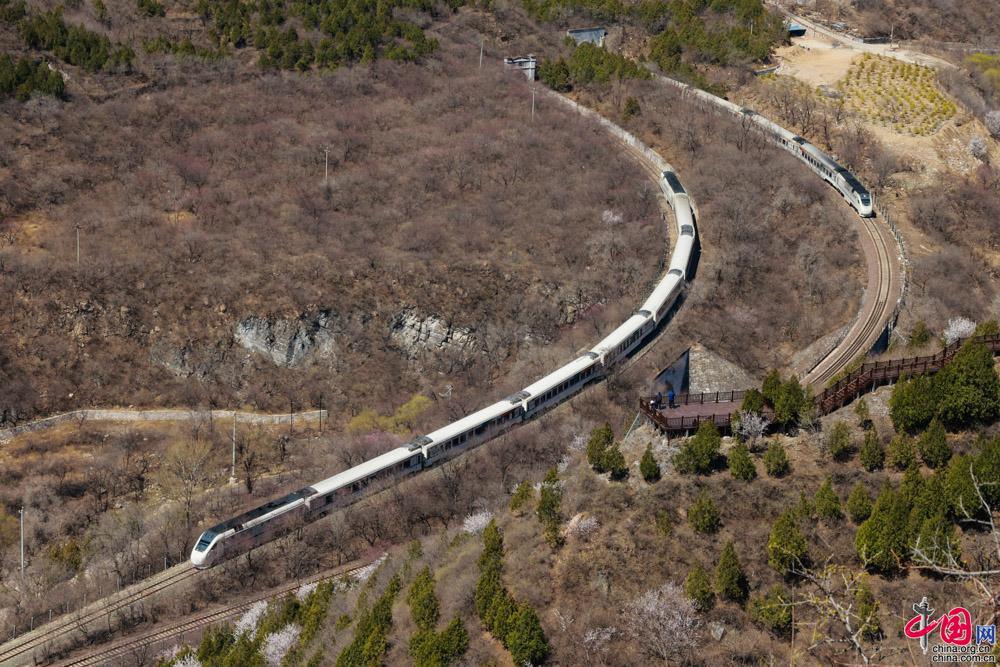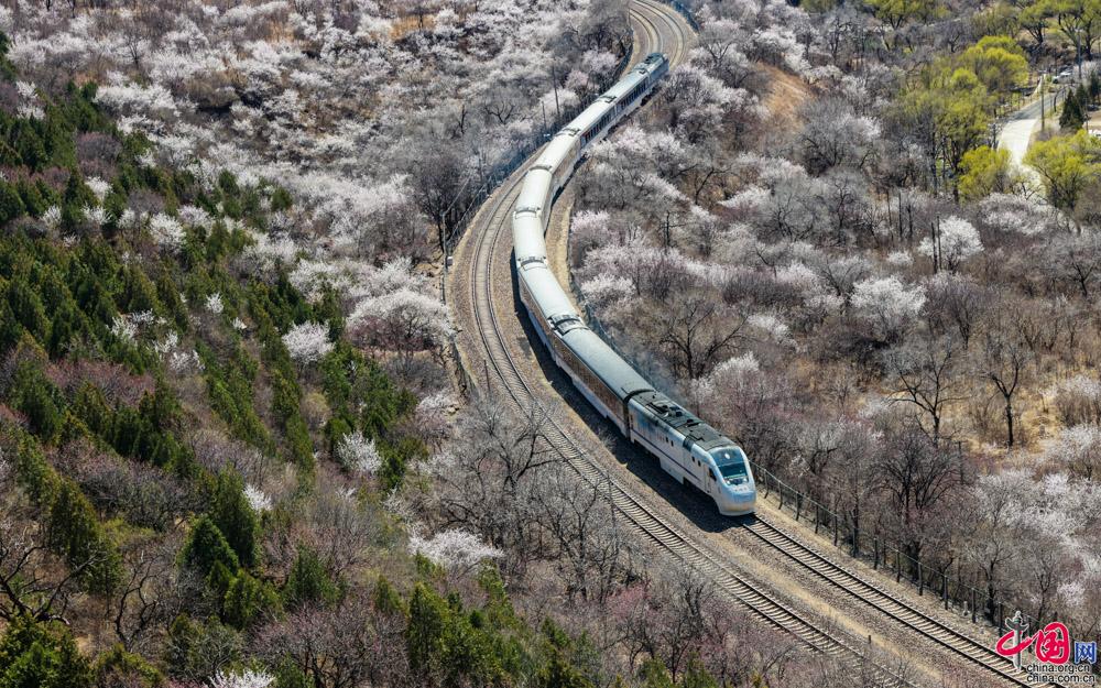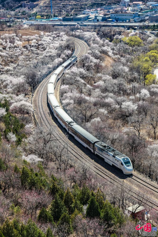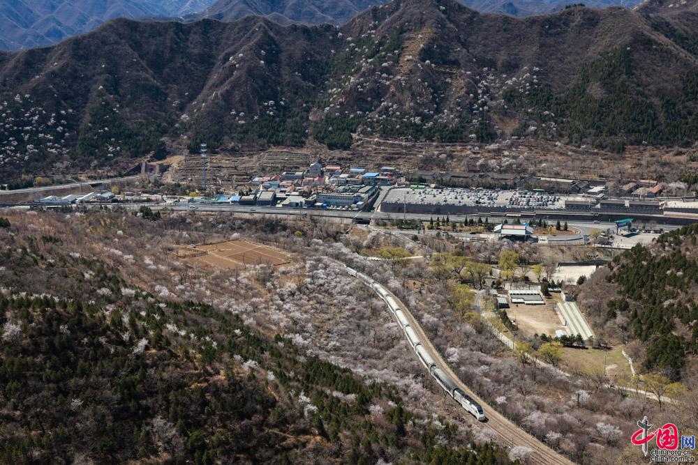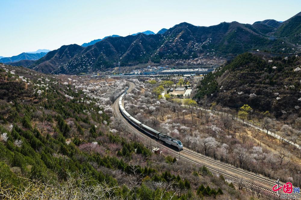 4月2日,一輛行駛在北京居庸關(guān)長城腳下花海景區(qū)的市郊S2線“長城號”列車,在漫山遍野的山花映襯下成景,游客稱其為“開往春天的列車”。 中國網(wǎng)記者 董寧 攝影