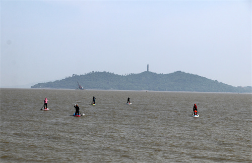 2022年4月24日,安徽省合肥市廬江縣一批游泳愛好者劃動槳板,在800里巢湖劈波斬浪,利用1小時時間就劃過4公里湖面,樂游姥山后再度返回。