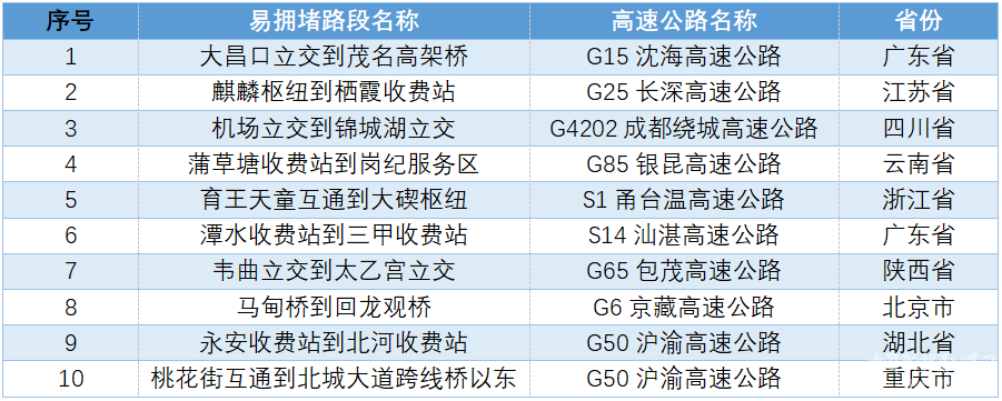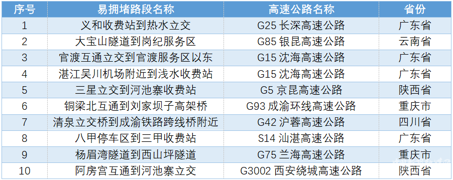 易擁堵緩行路段。假期期間,預(yù)計(jì)全國(guó)高速公路出程、返程易發(fā)生擁堵緩行的路段,如下表所示。
