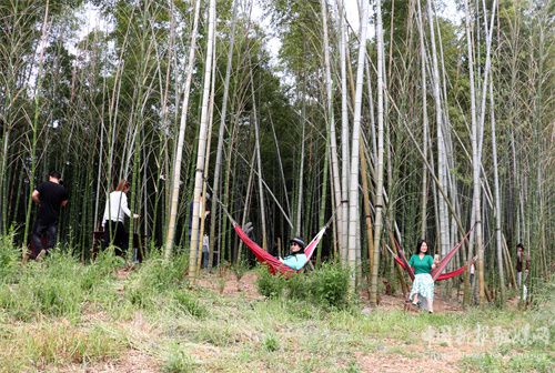 (2022年5月14日,周六,在安徽省合肥市廬江縣一竹谷旅游度假風景區(qū),游客正體驗蕩秋千的快樂。)
