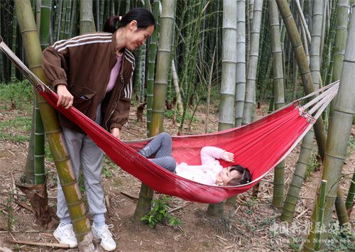 2022年5月14日,周六,在安徽省合肥市廬江縣一竹谷旅游度假風景區(qū),一位年輕的母親正帶著孩子體驗蕩秋千的快樂。