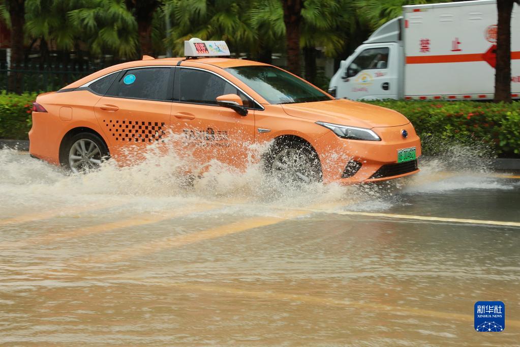 7月2日,在海南三亞市鳳凰路下洋田段,一輛出租車從積水中駛過。