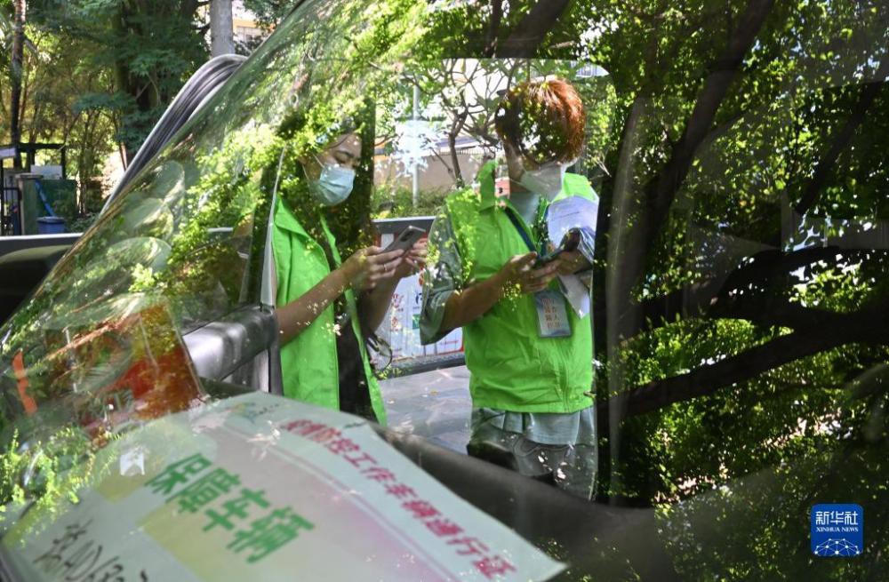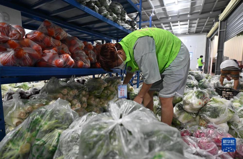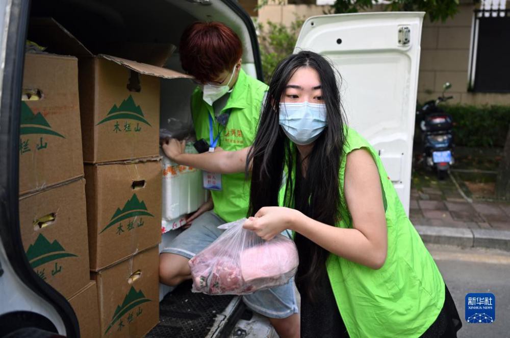 8月14日,吳凡力(左二)、張海洋在為市民配送生活物資。新華社記者 郭程 攝 8月14日,吳凡力(左)幫助市民訂菜。新華社記者 郭程 攝