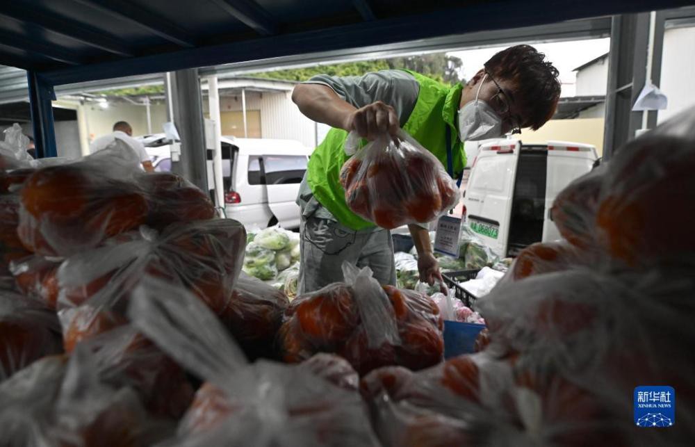 8月14日,吳凡力(左)幫助市民整理生活物資。新華社記者 郭程 攝