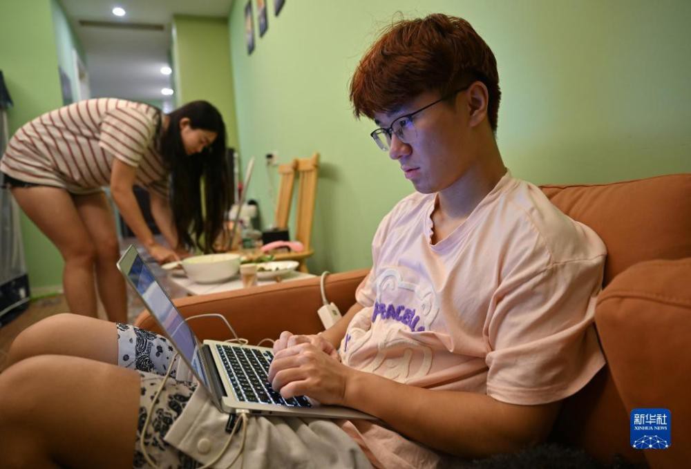 8月14日晚,張海洋(右)在家中上網(wǎng)課。他在俄羅斯阿列赫姆國(guó)立大學(xué)讀研二,受俄羅斯疫情影響,目前在國(guó)內(nèi)通過(guò)網(wǎng)絡(luò)上課。新華社記者 郭程 攝
