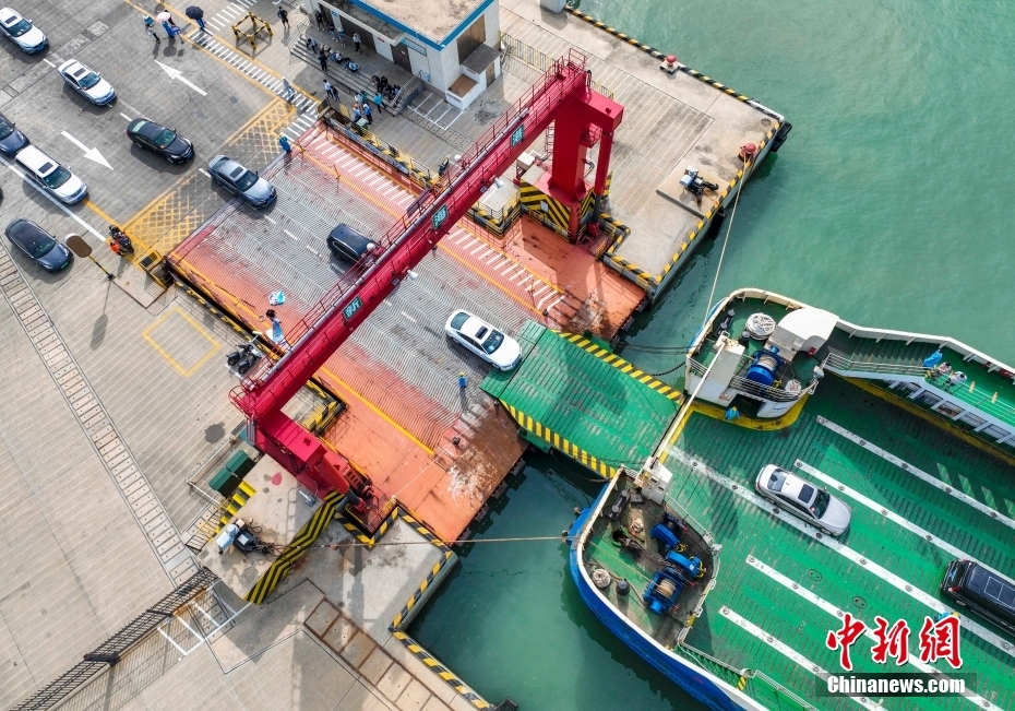 8月16日,海南首批870名健康管理驛站滯留旅客、152輛自駕車在??谛潞8鄞a頭乘船踏上離島返程之旅。當(dāng)日,??谑薪煌ǜ酆讲块T共安排6艘次出島船舶運(yùn)送健康管理驛站內(nèi)符合出島條件旅客,預(yù)留2艘次船舶作為備用運(yùn)力。圖為在??谛潞8圯喍纱a頭,符合離島要求的滯留自駕車輛排隊(duì)登上“??诰盘?hào)”輪船。(無(wú)人機(jī)照片) 中新社記者 駱云飛 攝