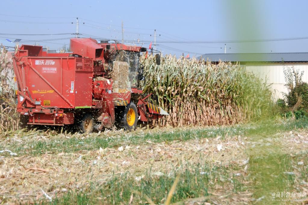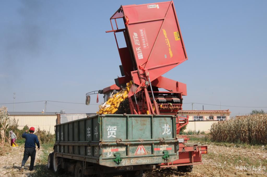 臨河區(qū)干召?gòu)R鎮(zhèn)黃濟(jì)村村民收割玉米。(新華社記者李云平 攝)