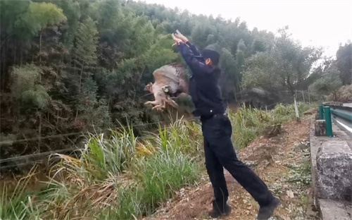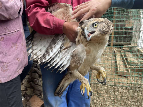 安徽休寧:蒼鷹被困雞棚 警民救助放生