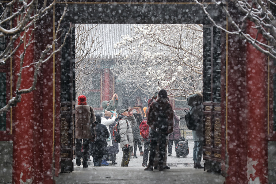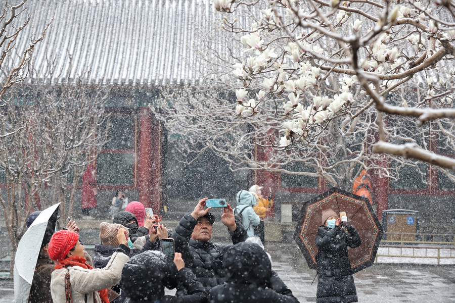 頤和園樂壽堂前的玉蘭在雪中盛放,吸引游人拍攝。(中國日報記者 姜東 攝)