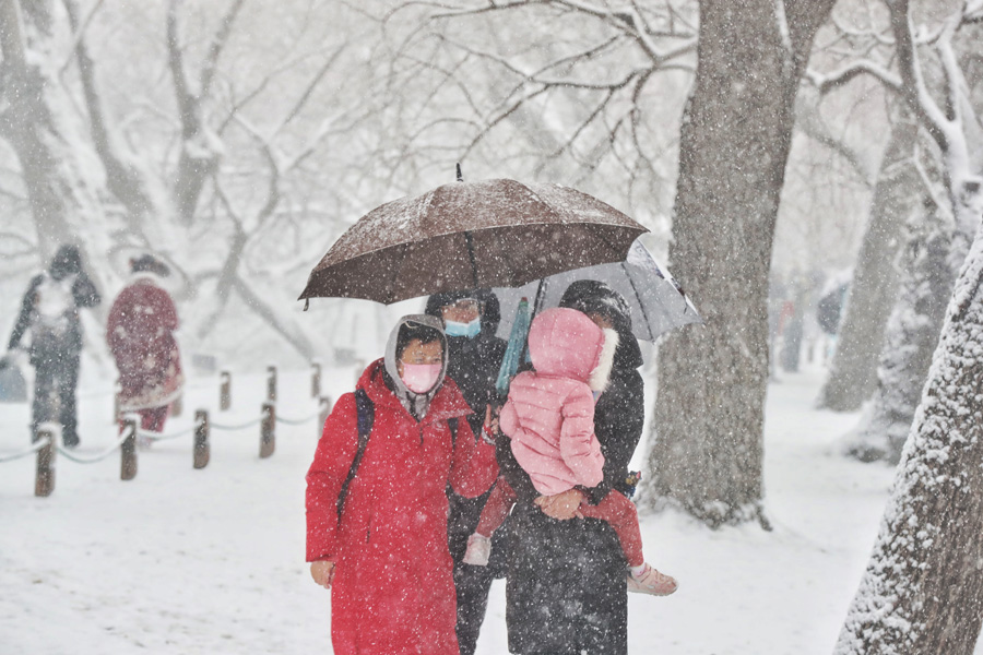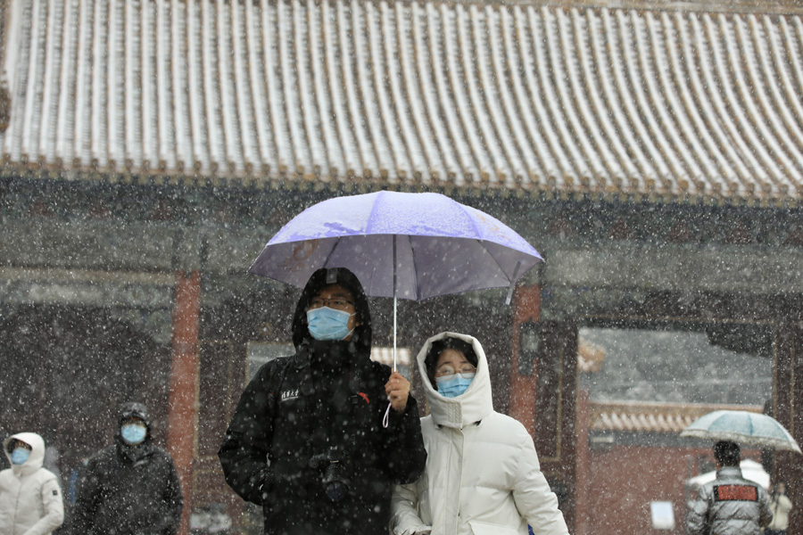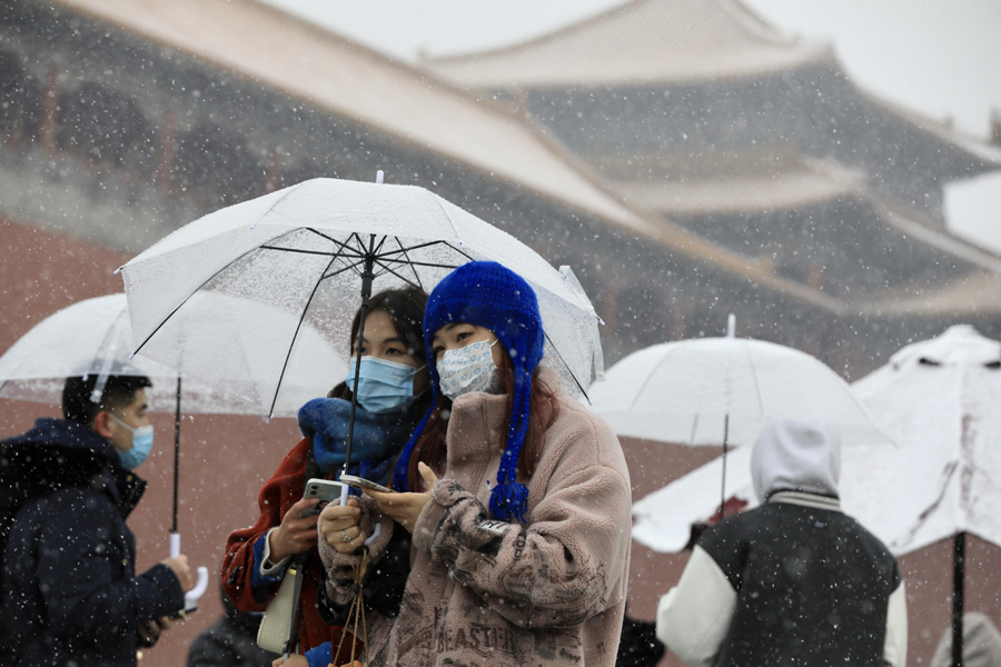 中國日報北京3月18日電(記者姜東 朱興鑫 王敬)2022年3月18日,北京迎來降雪天氣,游客冒雪在故宮、頤和園等景點欣賞雪景。當日上午,北京市氣象臺發(fā)布暴雪藍色預警。