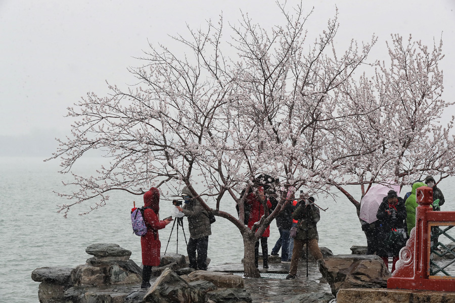 頤和園知春島上的山桃花在雪中盛放,吸引游人拍攝。(中國日報記者 姜東 攝)