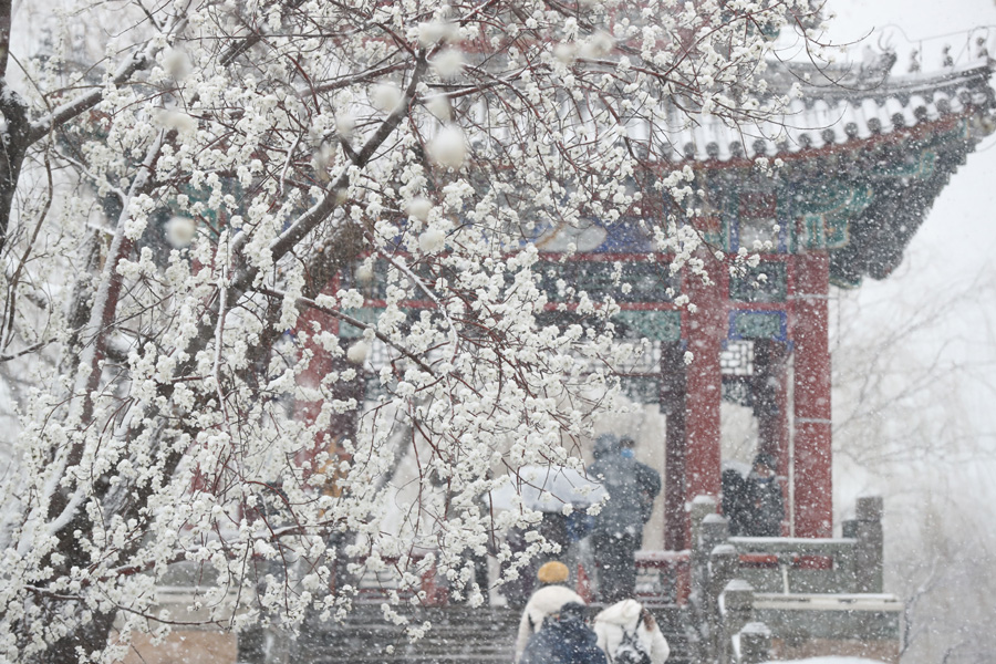 頤和園西堤的山桃花在雪中盛放,游客冒雪賞花。(中國日報記者 姜東 攝)