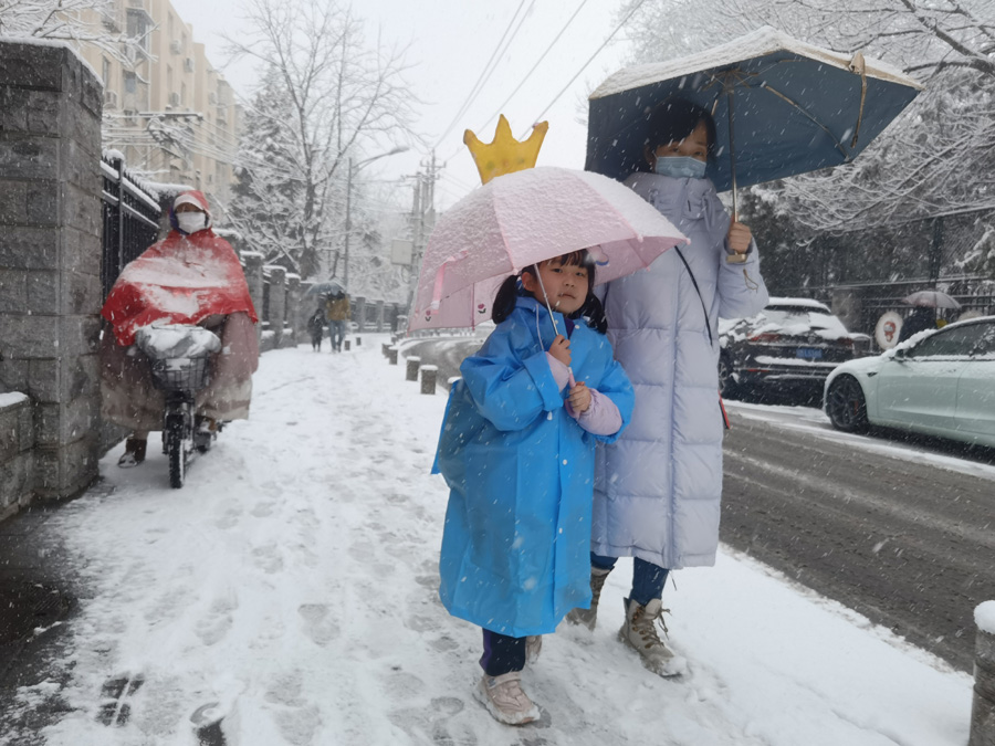 北京街頭,市民冒雪出行。(中國日報記者 王敬 攝)