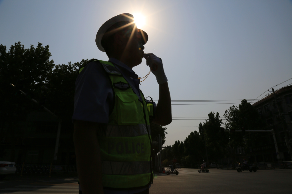 6月16日,交通警察在河北邢臺南和區(qū)一路口執(zhí)勤。新華社記者 朱旭東 攝
