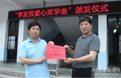 6月20日,休寧縣鶴城鄉(xiāng)新安源村黨總支書記李發(fā)權(quán)向鶴城實驗學(xué)校捐贈助學(xué)金4000元,并為20名品學(xué)兼優(yōu)的孩子發(fā)放獎學(xué)金。這是他第十一次捐資助學(xué),累計助學(xué)金額44000元。作為當(dāng)?shù)氐闹赂荒苋?,他積極帶領(lǐng)村民發(fā)展有機茶、香榧等特色產(chǎn)業(yè),促進村民增收致富。同時關(guān)心山區(qū)教育事業(yè)發(fā)展,從2012年開始,每年捐資助學(xué)4000元。2011年,李發(fā)權(quán)獲評“中國好人”。 (盛紅兵)