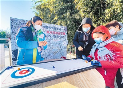 中央民族大學(xué)舞蹈學(xué)院臺生林家萱(左)在擔(dān)任北京冬奧會城市志愿者期間,鼓勵小朋友體驗桌面冰壺游戲。中新社記者 侯宇攝