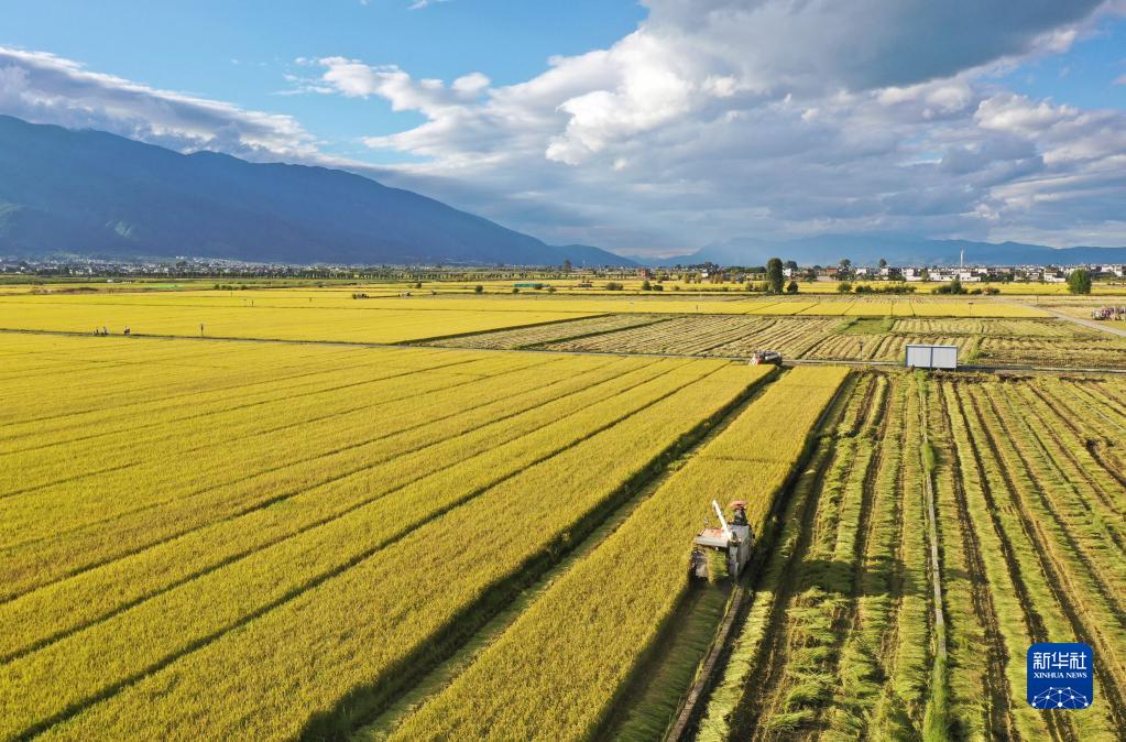 10月8日,在云南省大理白族自治州大理市灣橋鎮(zhèn),農(nóng)機(jī)手在收獲水稻(無(wú)人機(jī)照片)。