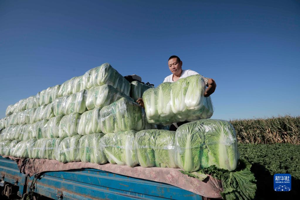 10月10日,河北省玉田縣虹橋鎮(zhèn)的農(nóng)民將收獲的白菜裝車(chē)外運(yùn)。
